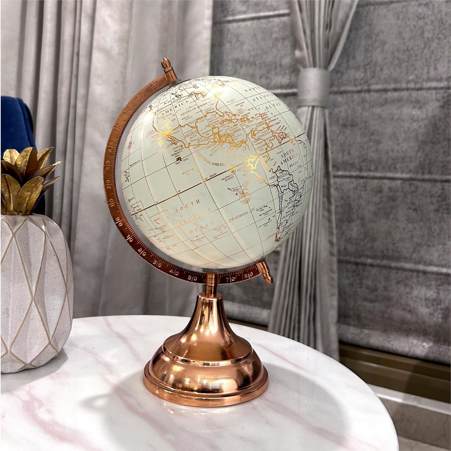 The White Rose Gold World Globe features an elegant design with a refined white surface combined with rose gold detailing and a sturdy rose gold metal base, bringing a luxurious, contemporary look while still preserving a touch of classic European charm. The product is crafted with a durable metal base and a high-quality plastic globe coated with an acrylic anti-scratch layer, enhancing durability while maintaining its beautiful shine and color over time. This is a handcrafted piece, meticulously created through multiple stages by skilled artisans, resulting in a sophisticated and highly valuable décor item.